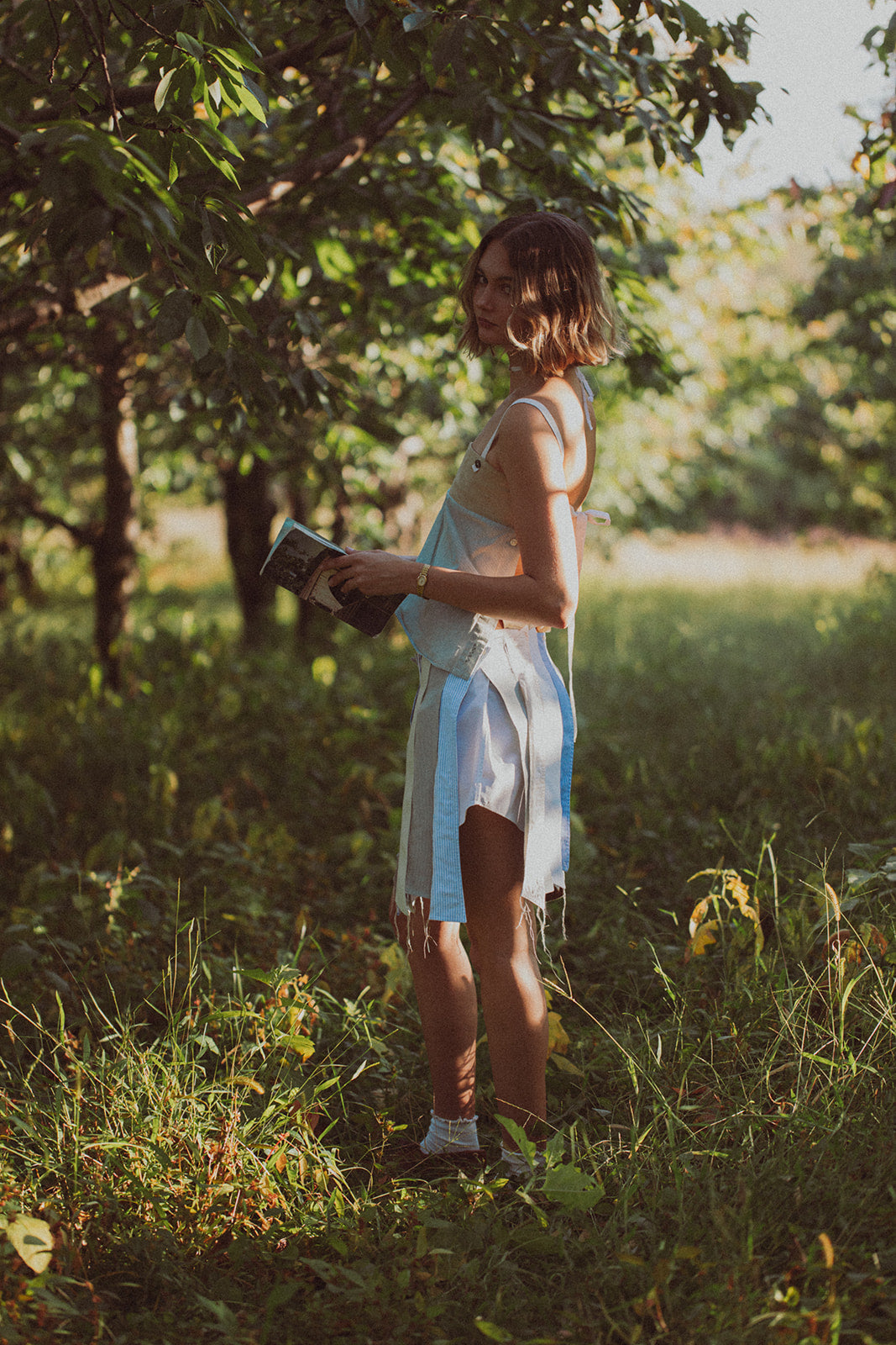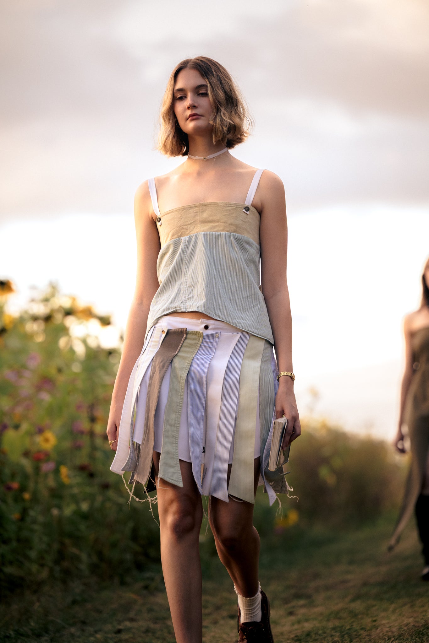 We used the collar of a suede jacket that had been removed as the top panel for the tank and sewed half of a men's button down to the bottom. We added button holes for the straps and used a collar as a back strap to tie it all together.